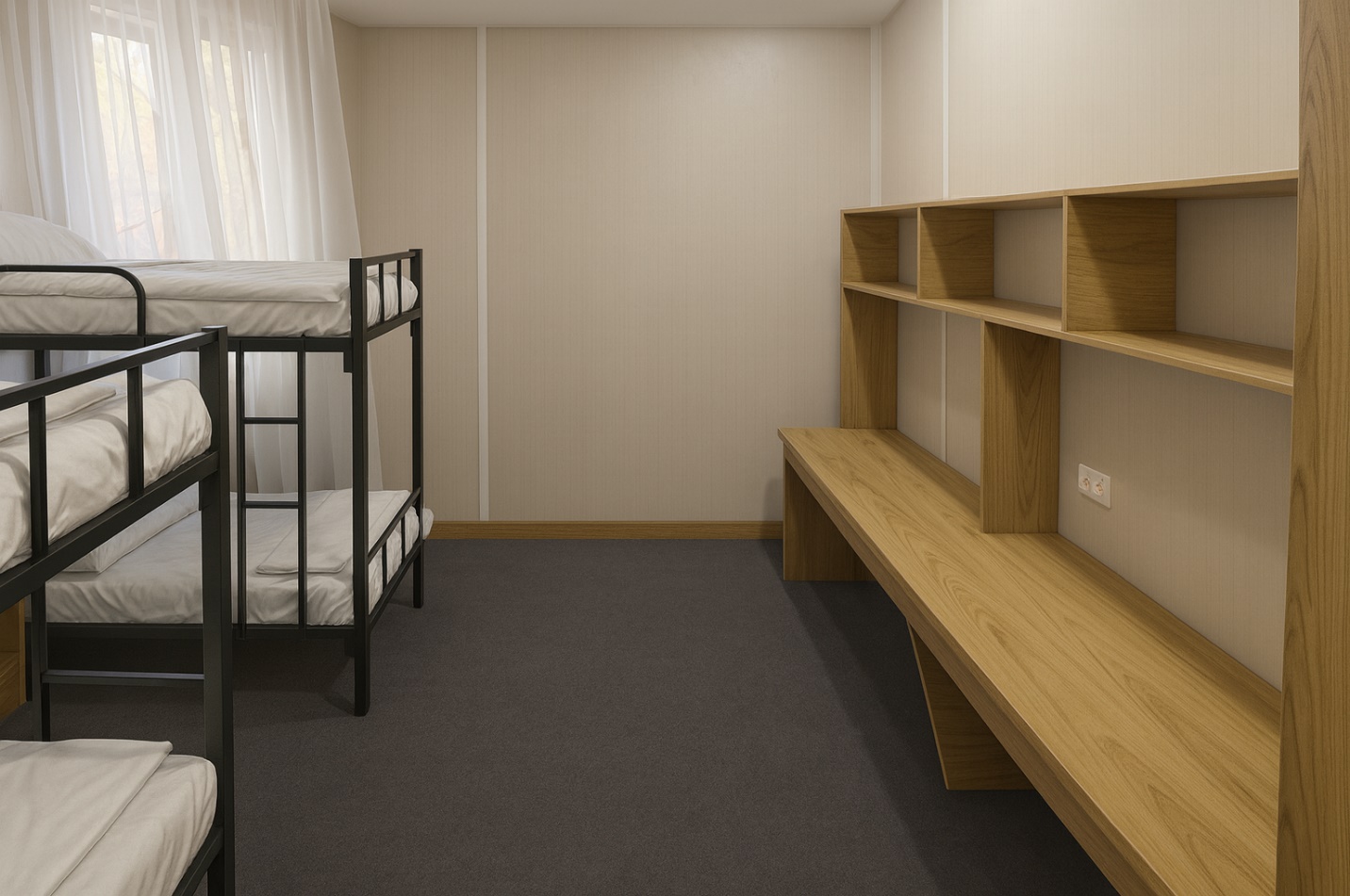 Comfortable living spaces equipped with essential furniture and amenities.